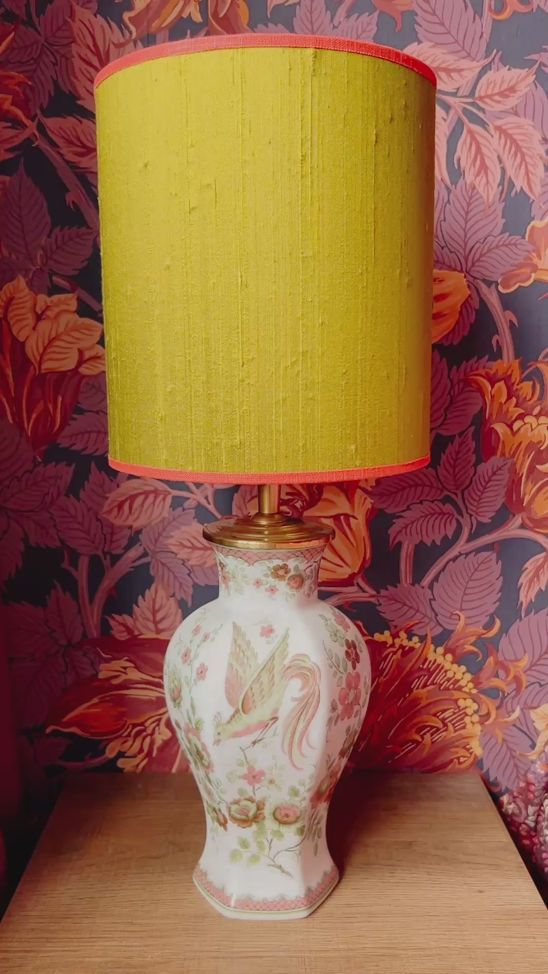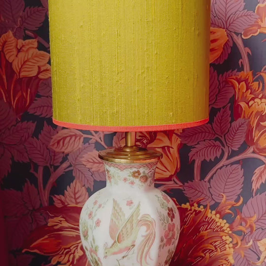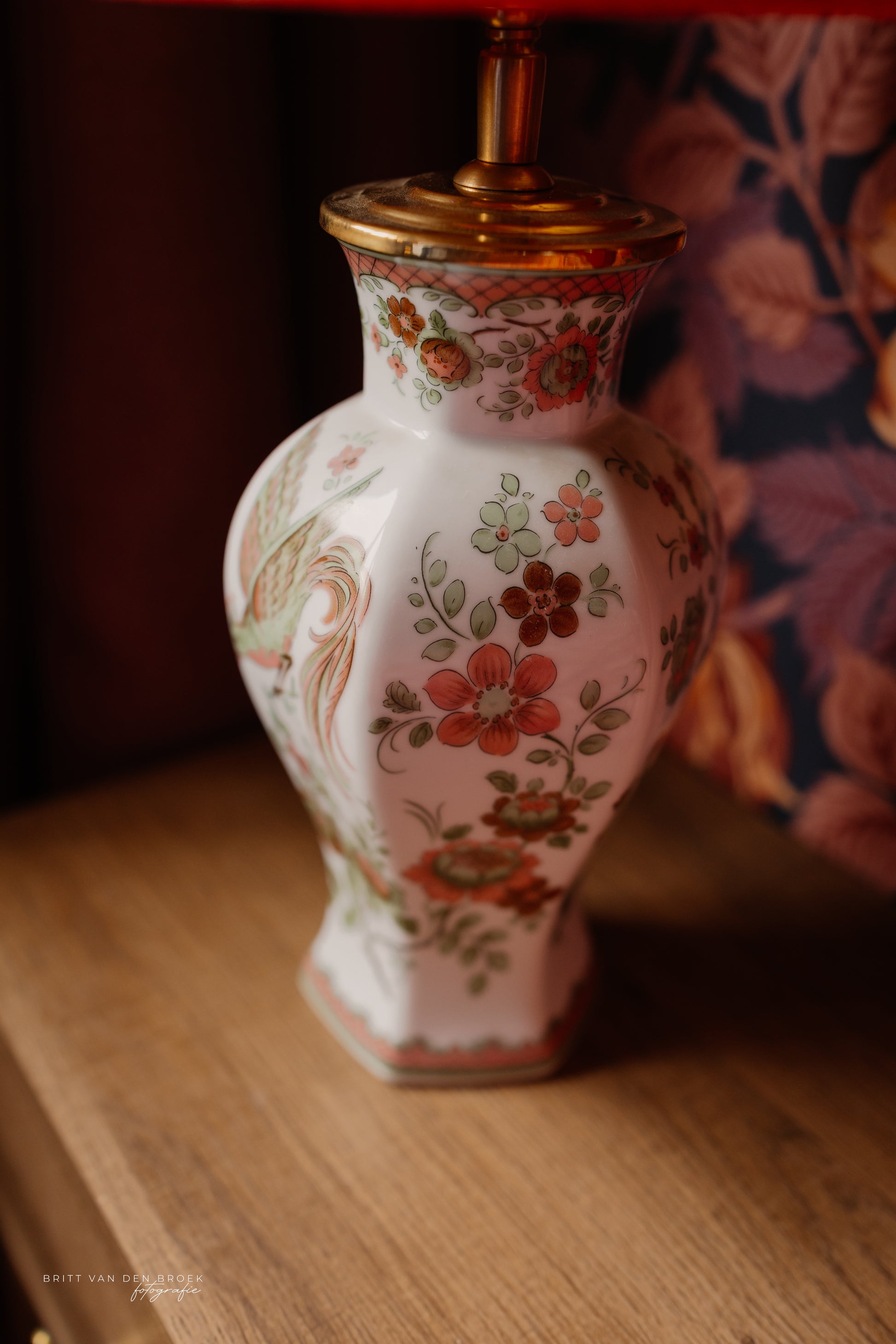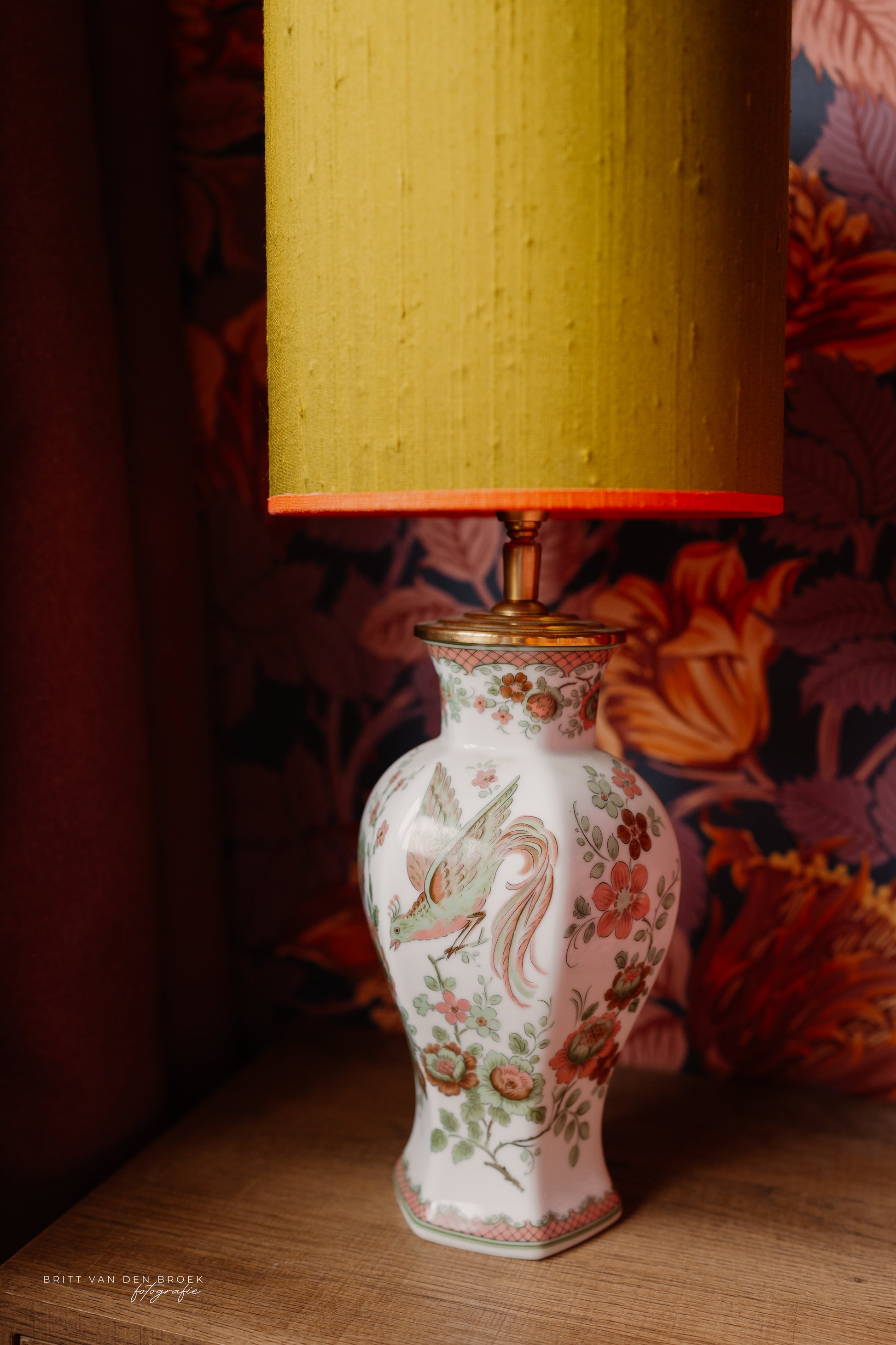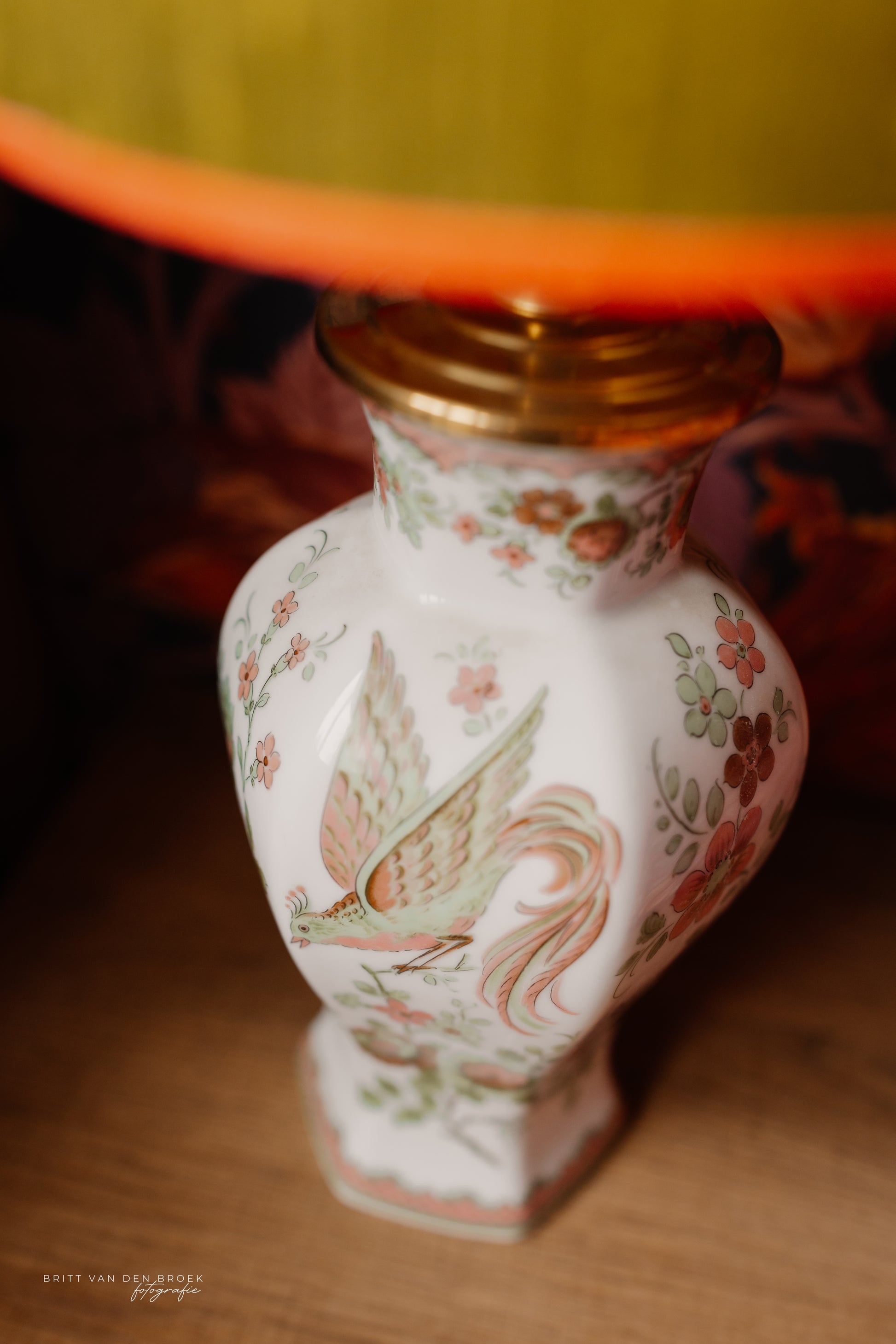 Op deze lampenvoet staan roze/groene bloemen en een vogel. Hij is tot de fitting 29 cm hoog. Op de foto staat er een lampenkap op de voet met een doorsnee van 20 cm en een hoogte van 22 cm. Dit maakt de set zoals op de foto 51 cm hoog.