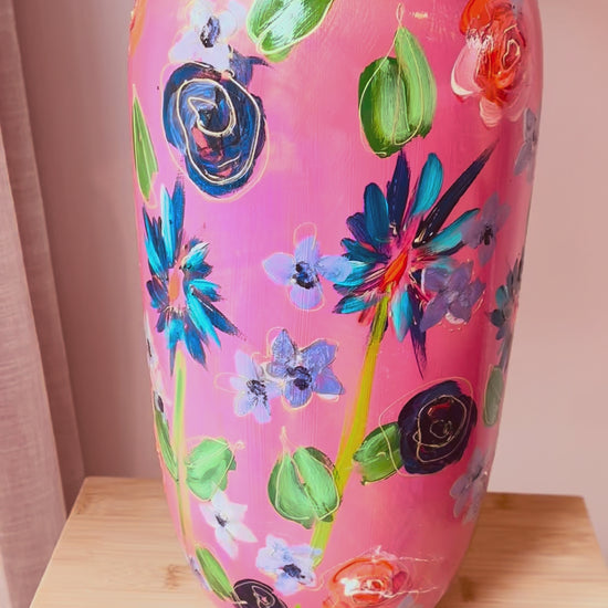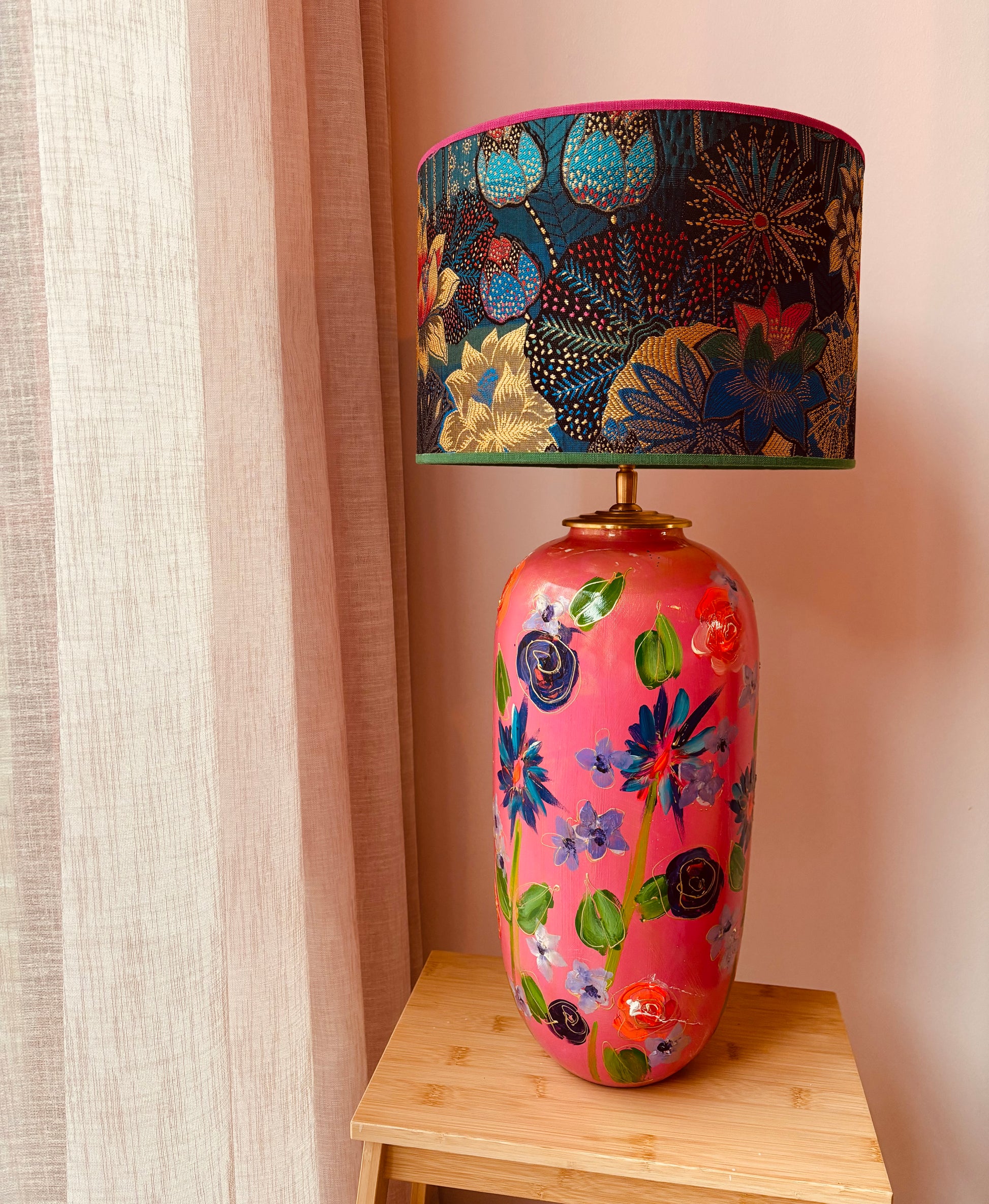 Deze lampenvoet is gemaakt van een roze, door mij zelf handgeschilderde vaas. Er staan bloemen en bladeren in verschillende kleuren op. Hij is tot de fitting 45 cm hoog. Op de foto staat er op de voet een lampenkap met een doorsnee van 30 cm en hoogte van 20 cm. Dit maakt de set 65 cm hoog.