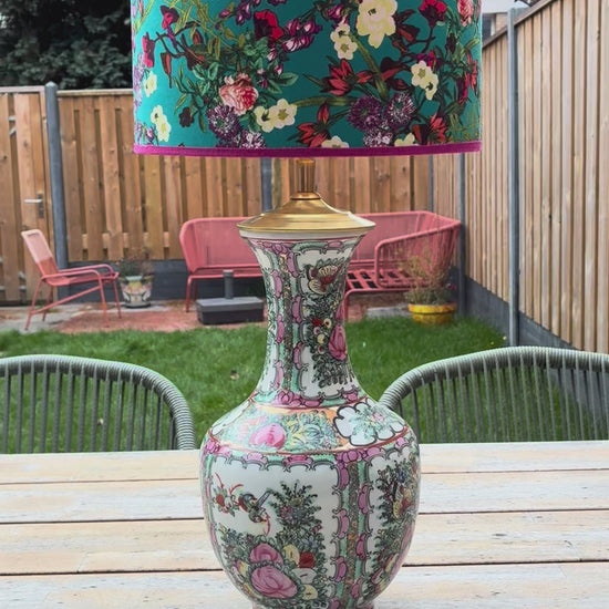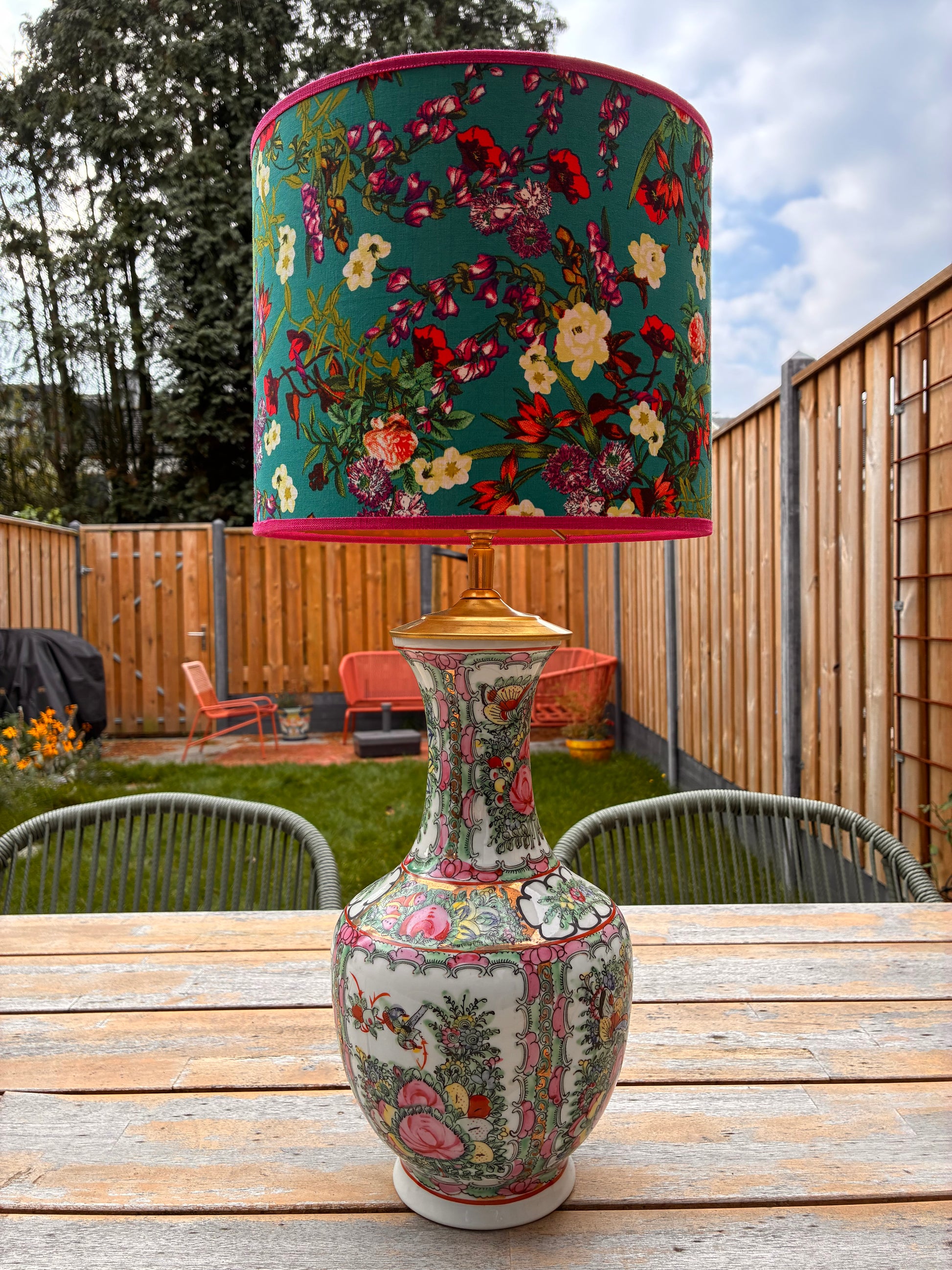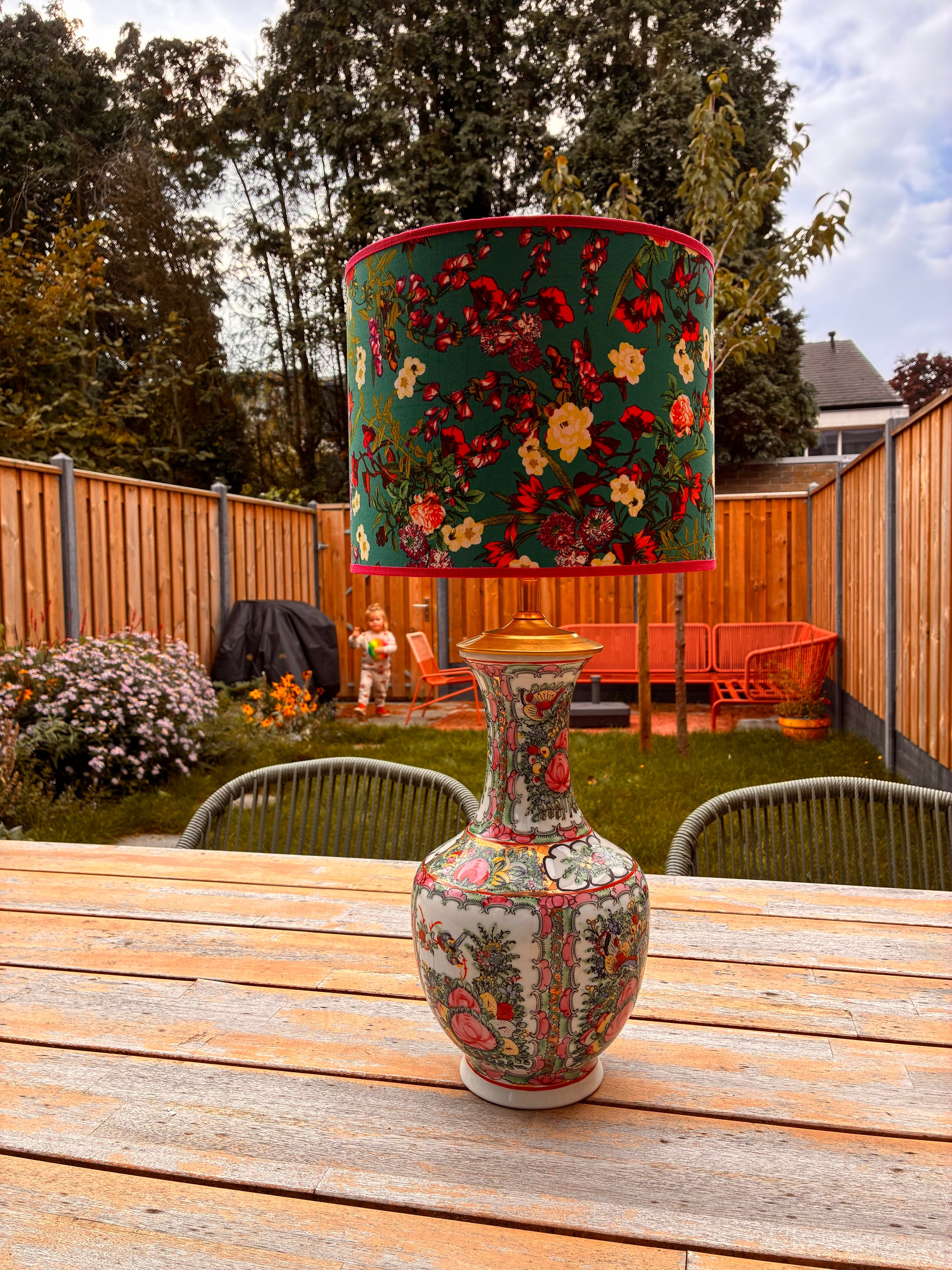 Deze lampenvoet is gemaakt van een rijkversierde, bijzonder gevormde vaas met bloemen in vooral de kleuren groen en roze. Hij is tot de fitting 36 cm hoog. Op de foto's staat er op de lampenvoet een lampenkap met een doorsnee van 25 cm en hoogte van 20 cm. Dit maakt de set zoals op de foto 56 cm hoog.