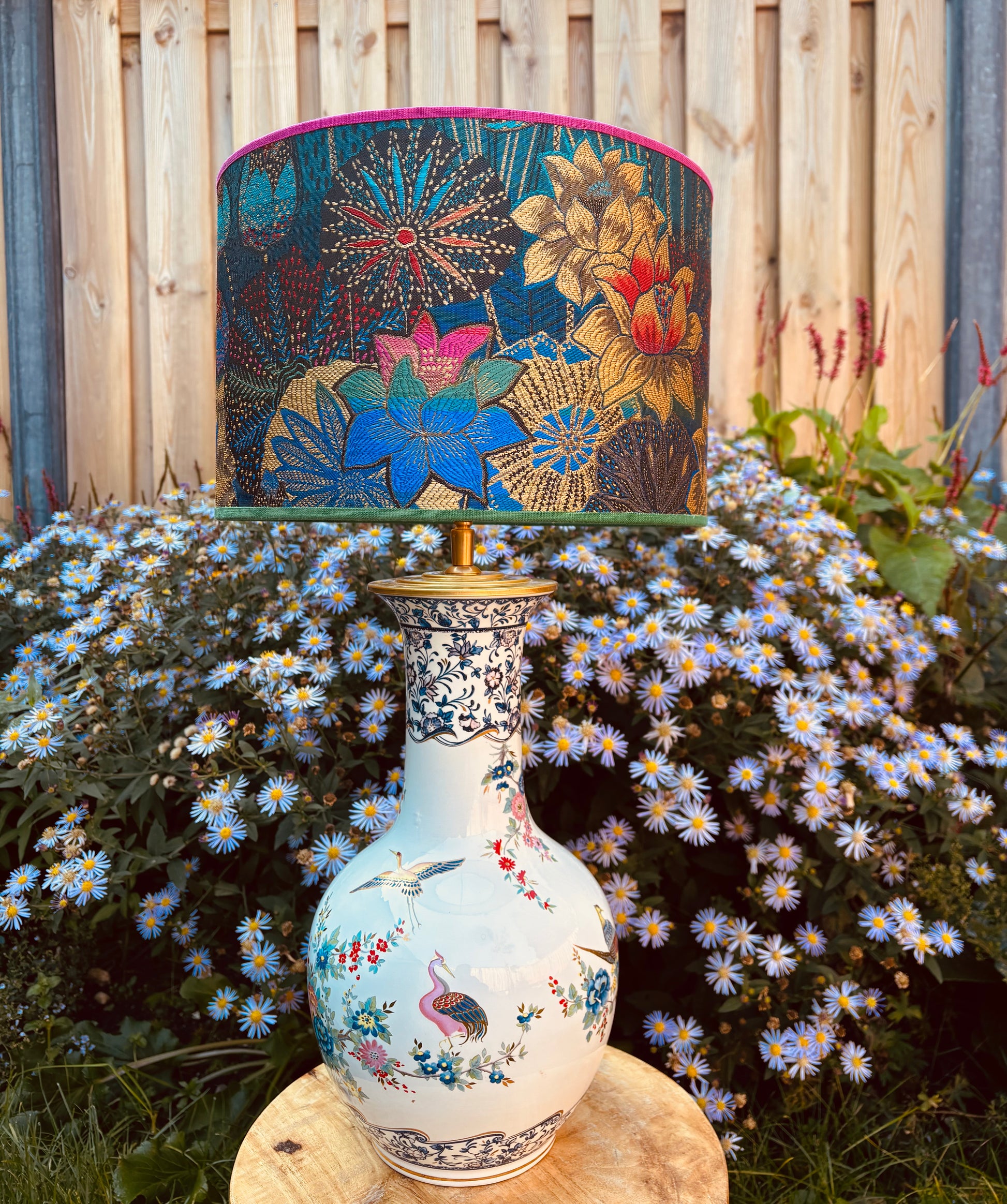 De lampenvoet is gemaakt van een witte vaas met een mooie print van vogels en bloemen. Hij is tot de fitting 40 cm hoog. Op de foto staat er op de voet een lampenkap met een doorsnee van 30 cm en hoogte van 20 cm. Dit maakt de set 59 cm hoog.