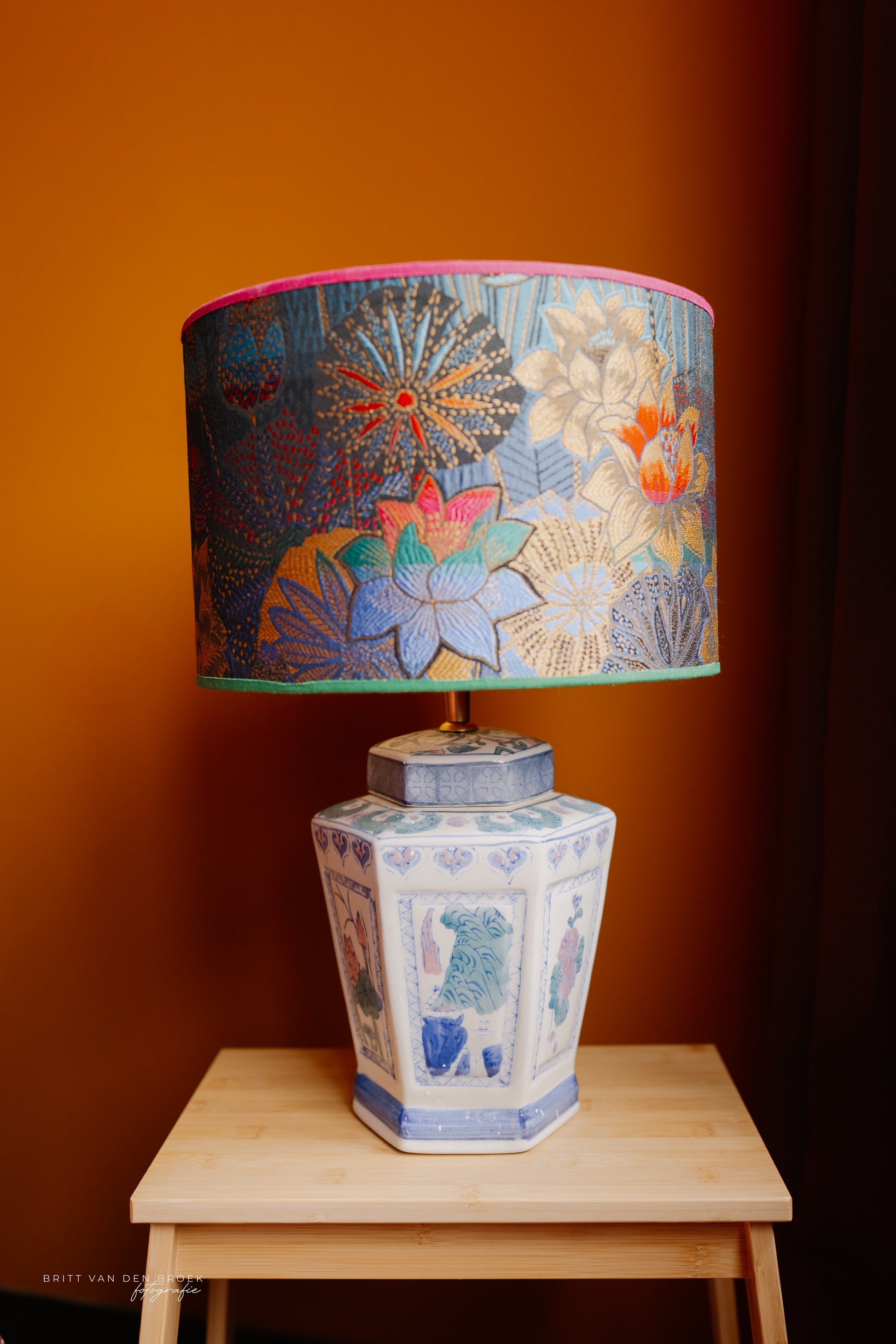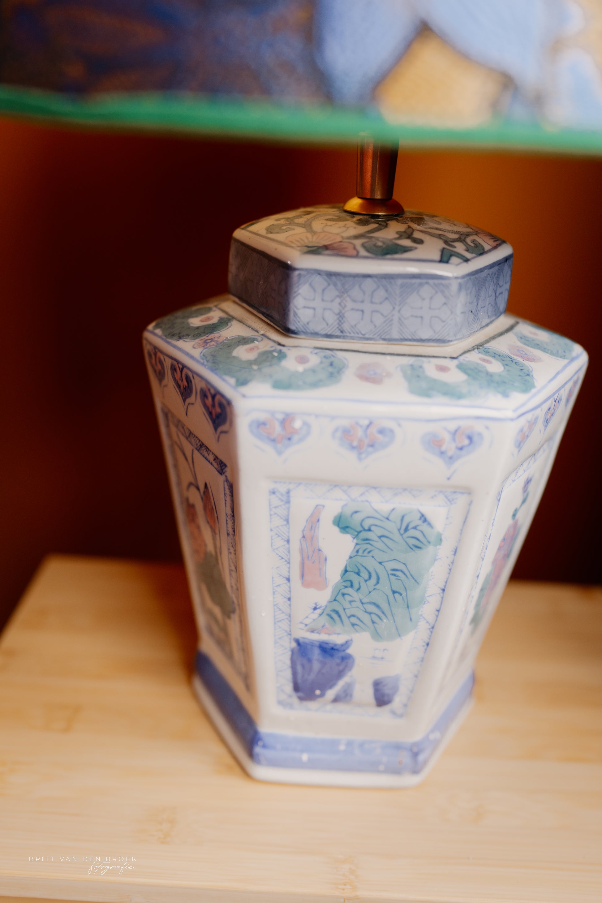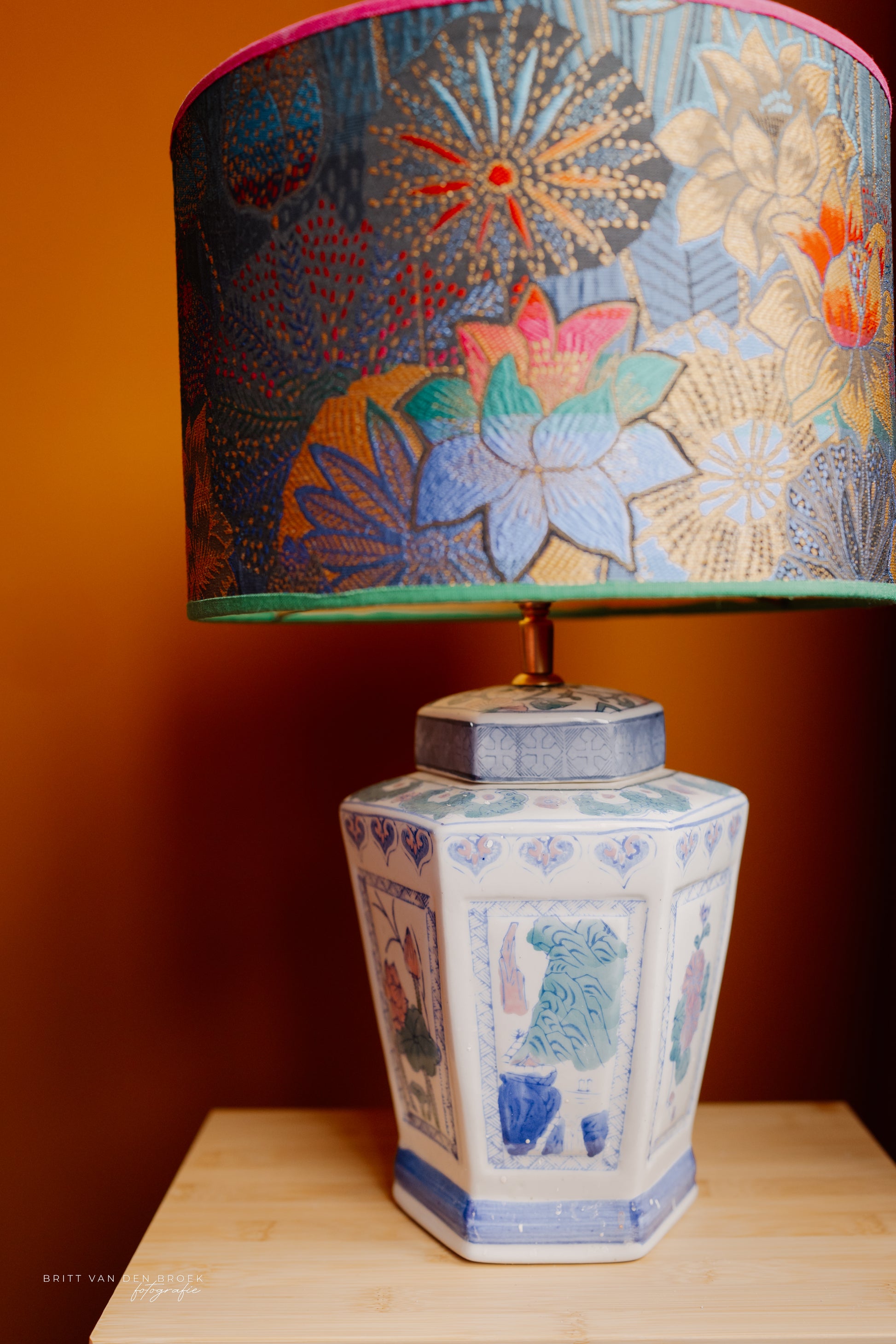 Deze lampenvoet is gemaakt van een zeshoekige gemberpot en is 28 cm hoog tot de fitting. Op deze lampenvoet staat een lampenkap met een doorsnee van 29 cm en hoogte van 20 cm. De set zoals op de foto is 47 cm hoog.