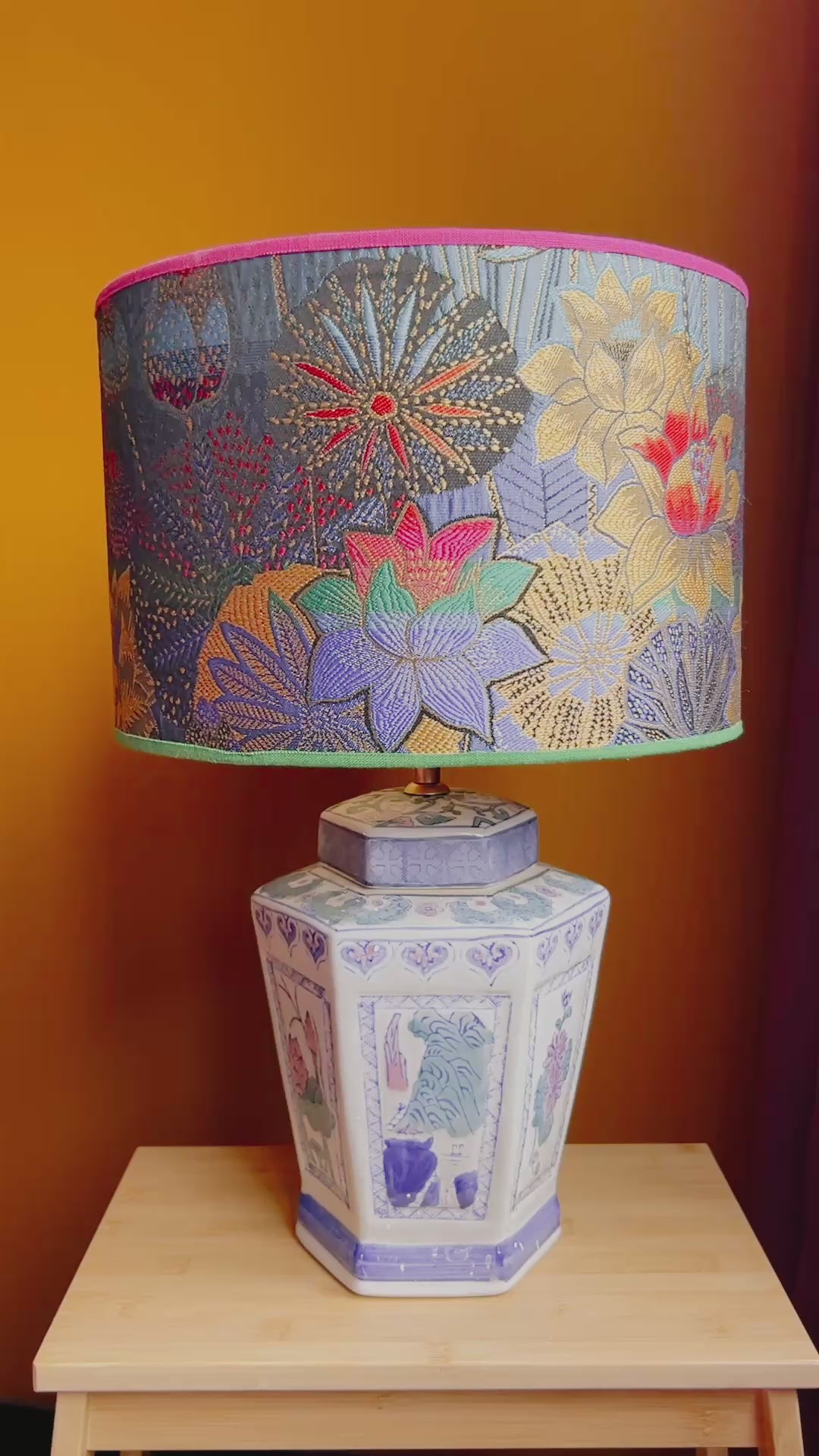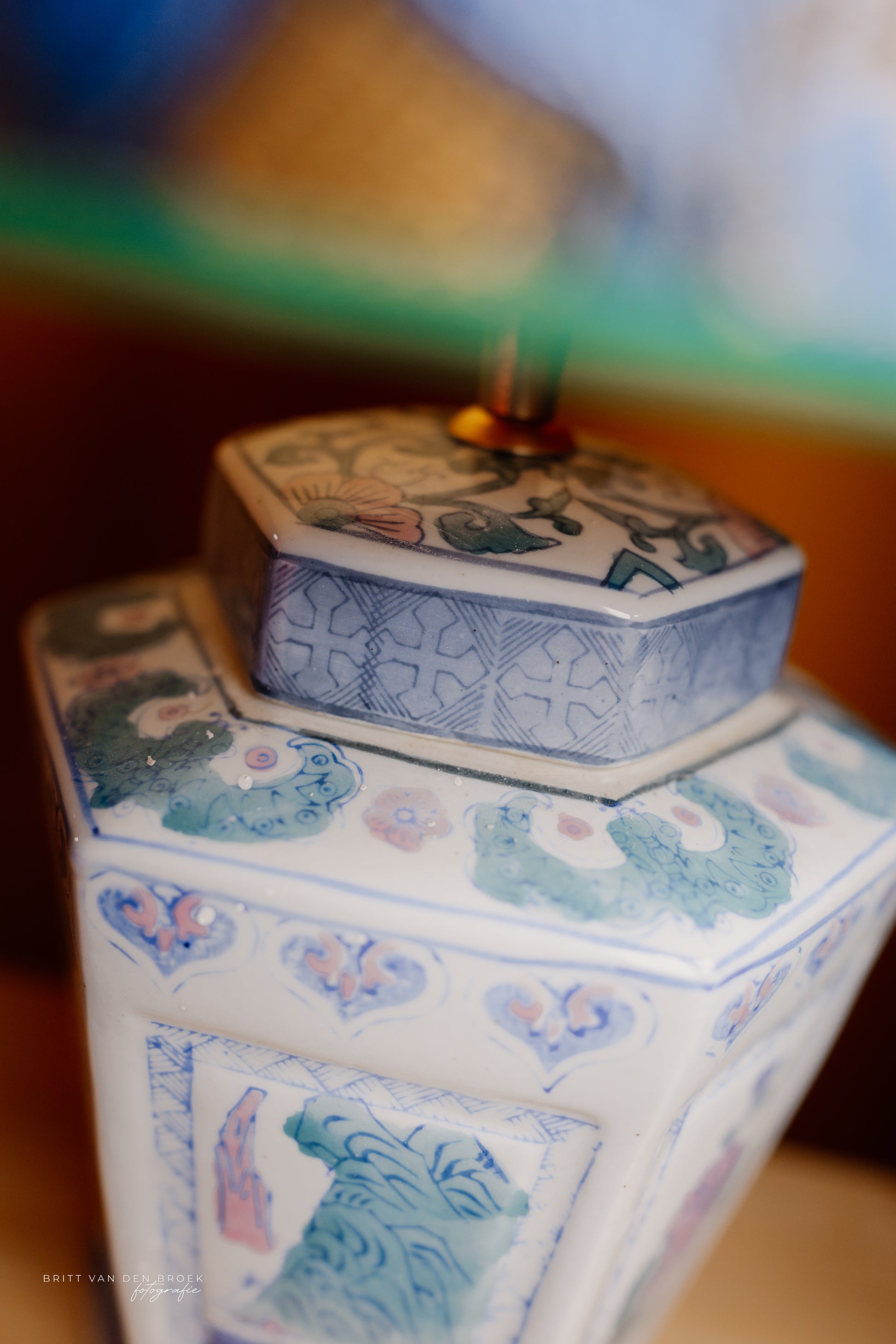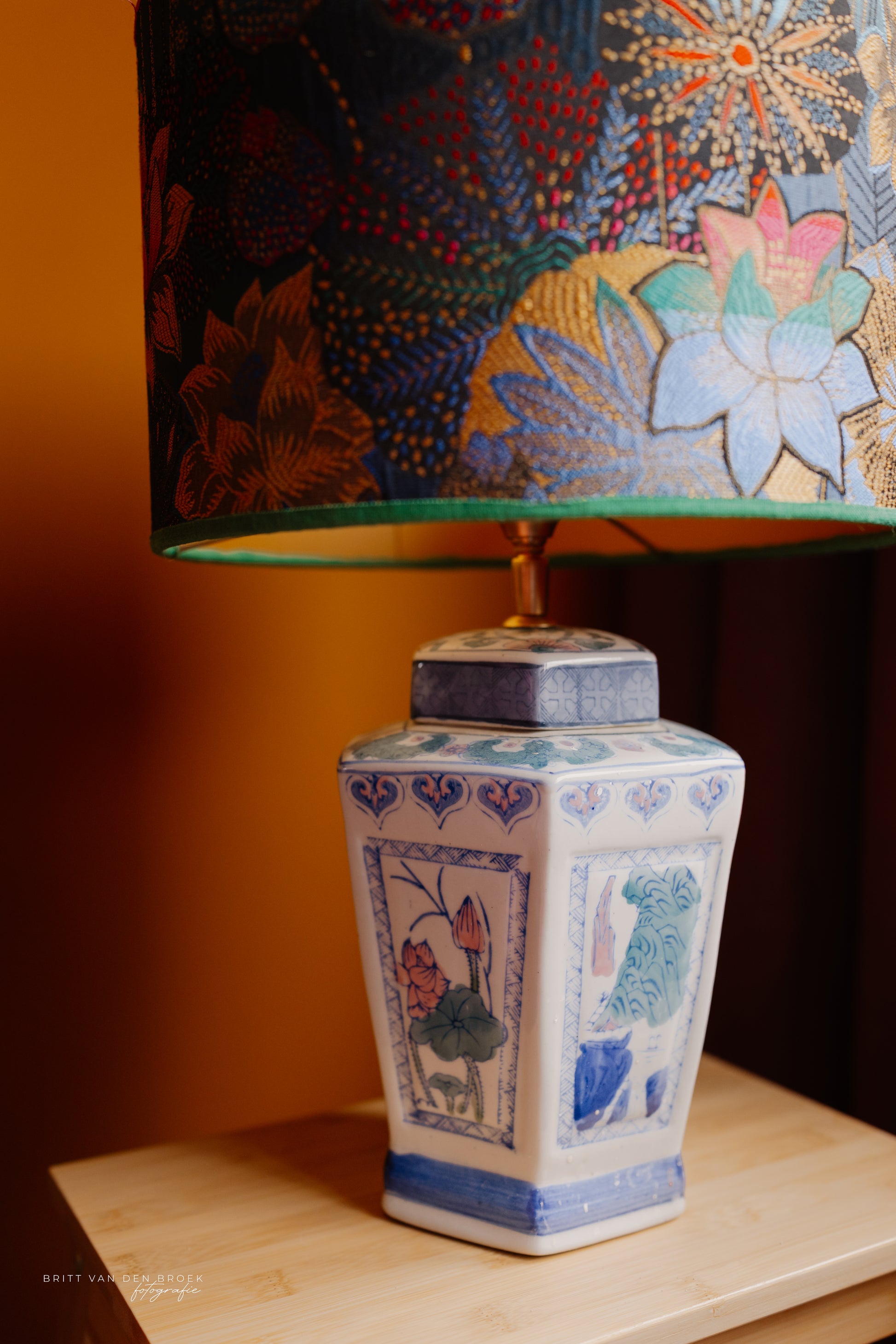 Deze lampenvoet is gemaakt van een zeshoekige gemberpot en is 28 cm hoog tot de fitting. Op deze lampenvoet staat een lampenkap met een doorsnee van 29 cm en hoogte van 20 cm. De set zoals op de foto is 47 cm hoog.